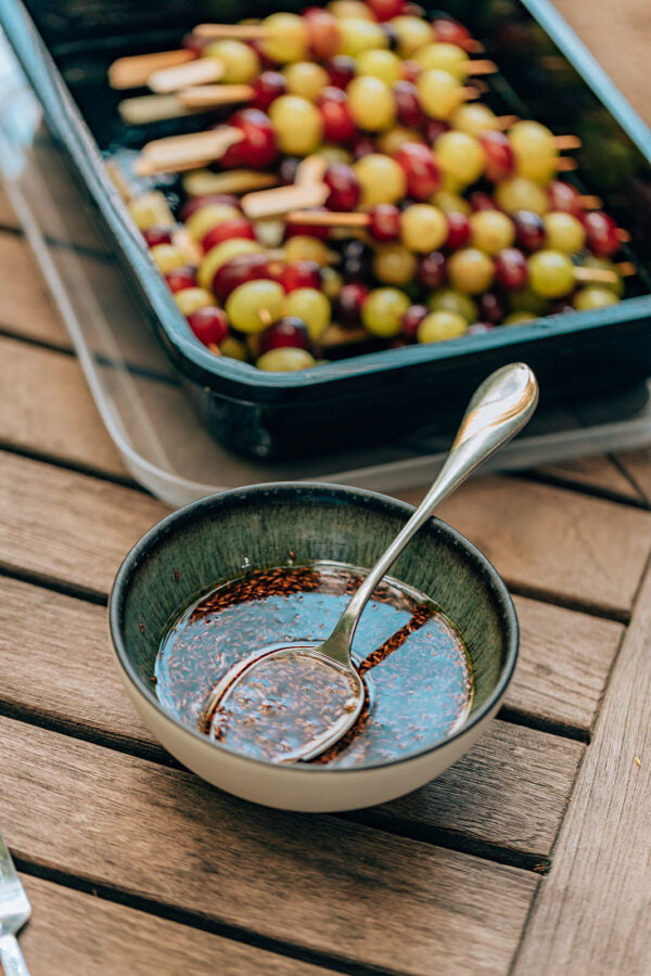 5. Steek de druiven op prikkers, en wissel af per kleur om een mooi visueel geheel te verkrijgen. Opgelet: gooi de overgebleven marinade niet weg! Je hebt deze straks nog nodig.
