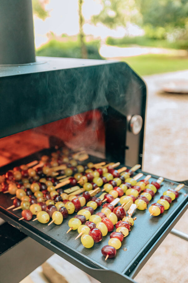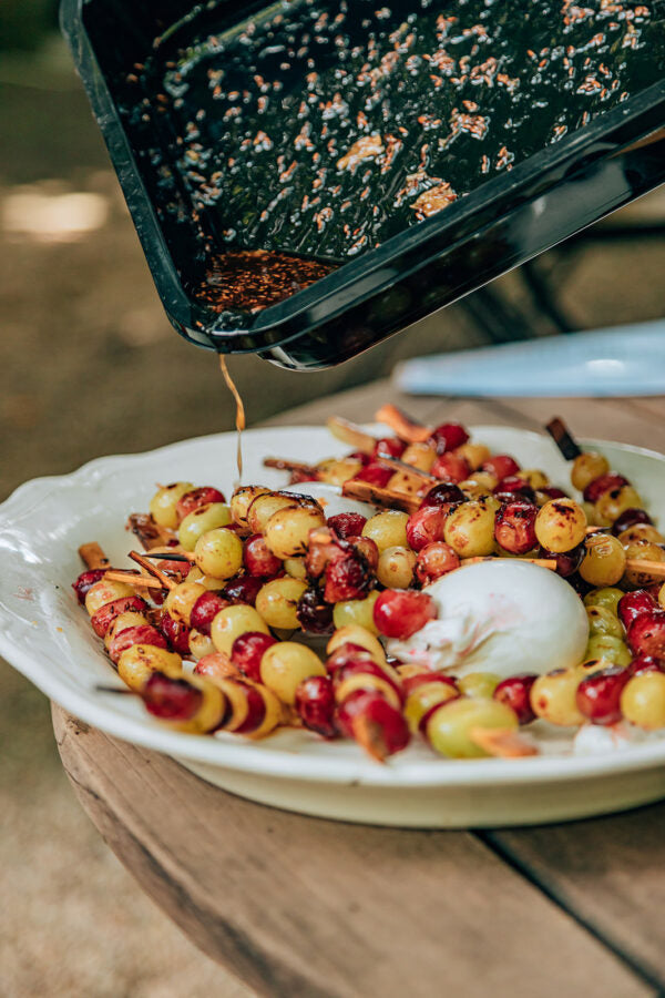 Dit receptje is geïnspireerd op een recept van de populaire chef Ottolenghi. Het recept werd aangepast voor de houtoven. Dankzij het houtaroma komen de zoete toetsen van de gegrilde druiven des te meer tot hun recht. De marinade met venkelzaad zorgt voor een heerlijk Oosterse sfeer.