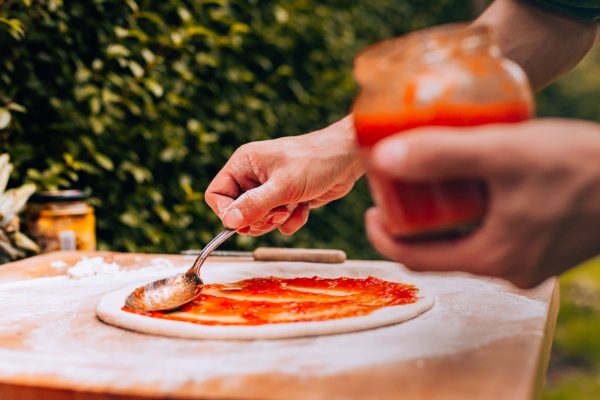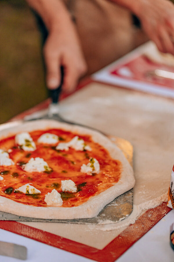 - Vanaf je de pizza belegt met saus en andere toppings, vergroot de kans dat door de vochtigheid het deeg aan de pizzaschep gaat plakken. Snel werken is dus de boodschap!
