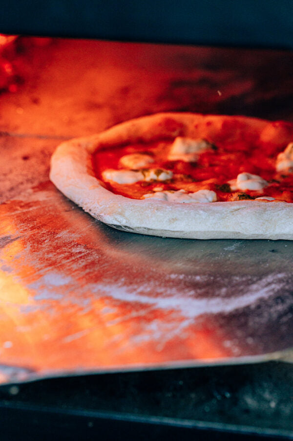- Tijd om de pizza te bakken! Controleer even of de pizza nog steeds vrij beweegt op de pizzaschep door deze lichtjes heen en weer te schudden (merk je dat ze intussen toch weer plakt, maak dan die plek los met wat bloem).