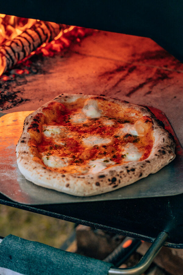 - Eenmaal de pizza de bakvloer begint te raken, trek je de schep in een snelle beweging uit de oven.