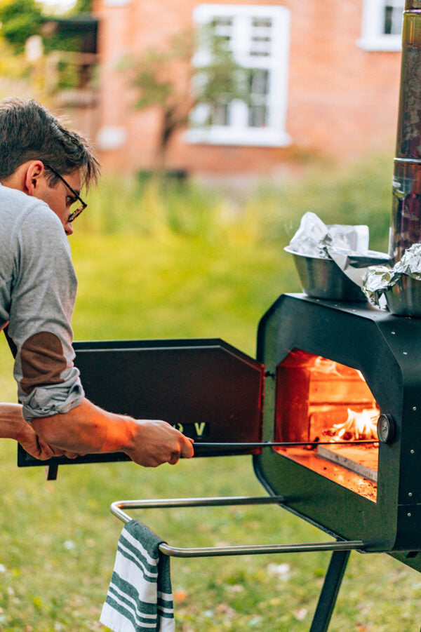 - Veeg de oven schoon, en leg indien nodig een extra blok hout op het vuur zodat de vlam mooi over het plafond naar de schoorsteen brandt, en zo ook de bovenkant van de pizza gelijkmatig bakt.