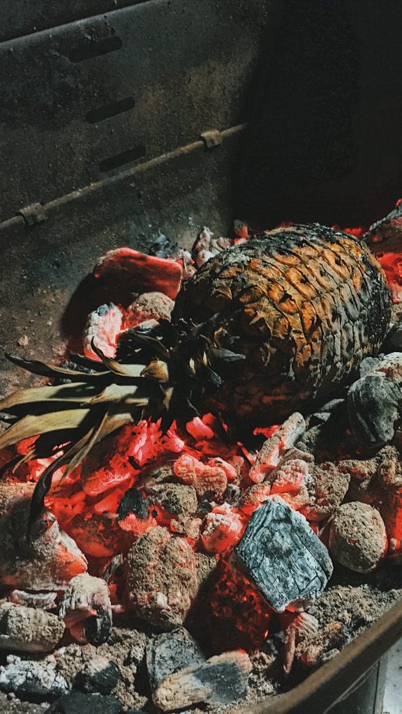 1. Leg de volledige ananas op de stenen ovenvloer tussen 150° en 300° C, of op een bedje gloeiende kolen, zonder vlam.