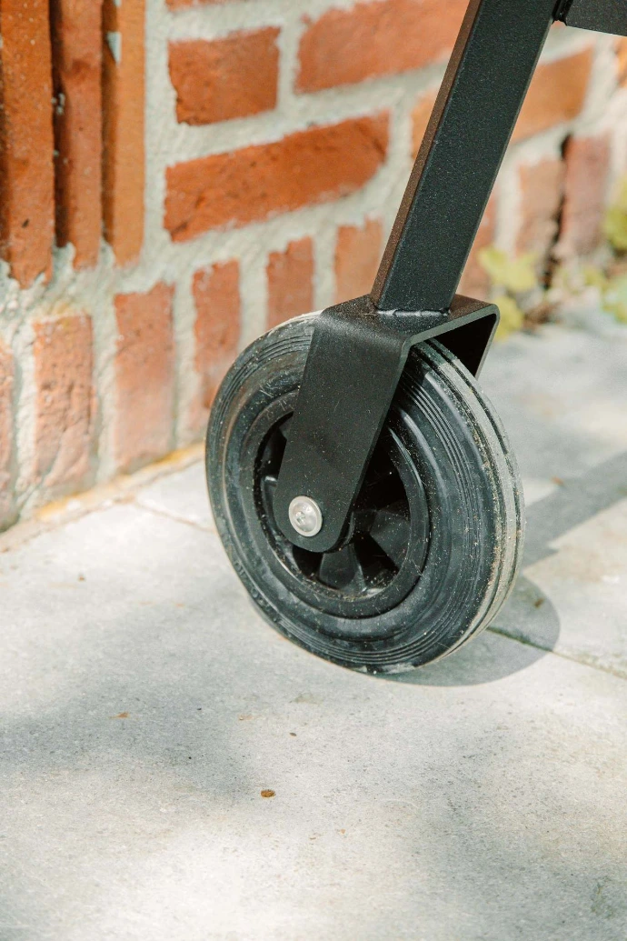 Het terras, de tuin, of een naar de buren? Dankzij de dikke rubberen wielen kan je Vonken overal mee naar toe nemen, net alsof het een kruiwagen is.